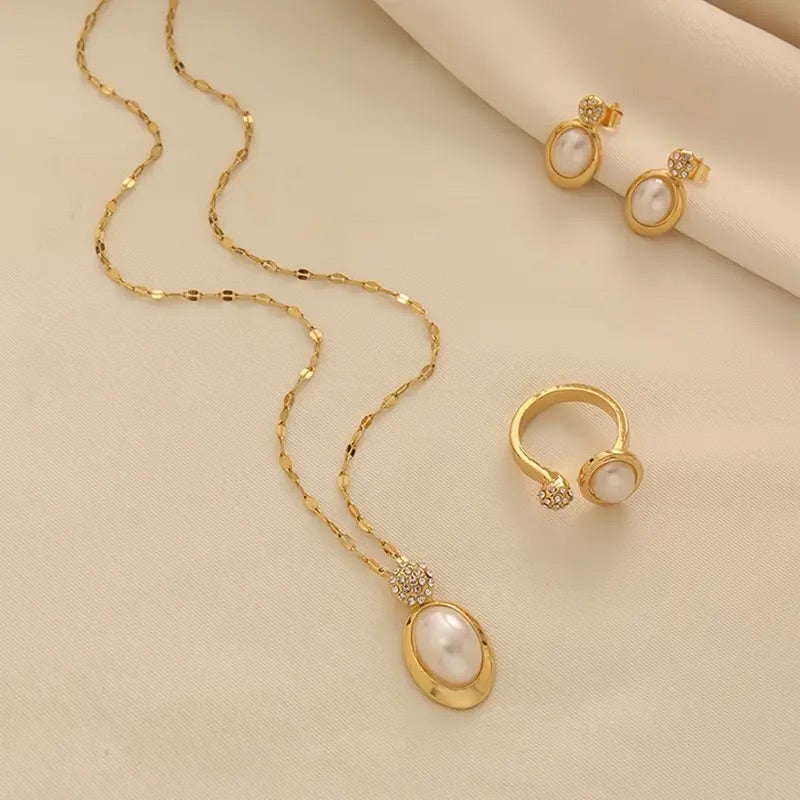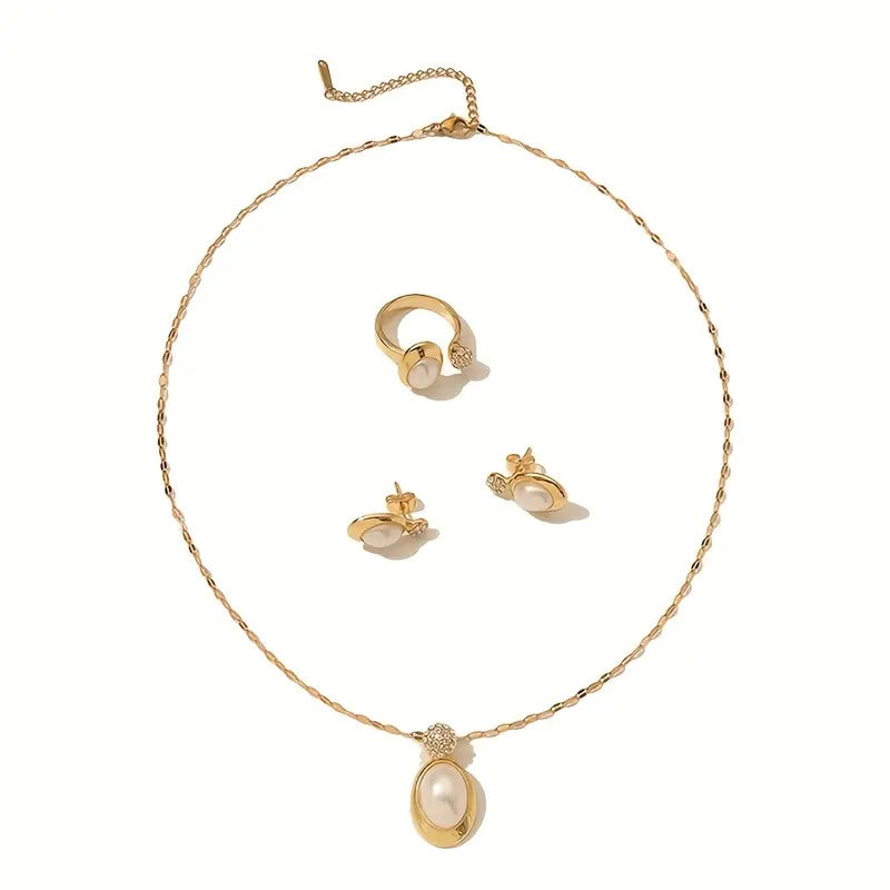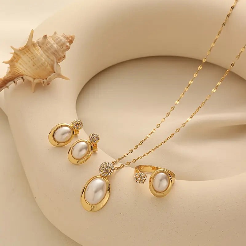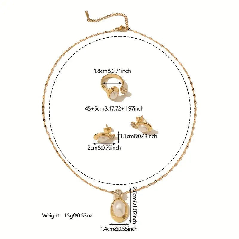 Świętuj styl i elegancję dzięki temu wykwintnemu 3-częściowemu zestawowi biżuterii wykonanemu ze złocistego stopu miedzi, ozdobionemu sztucznymi imitacjami pereł i okrągłym wisiorkiem. Zestaw zawiera elegancki naszyjnik, pasujące kolczyki i pierścionek — idealny jako prezent na święta, urodziny lub jako wyrafinowany dodatek do codziennego noszenia. Delikatne połączenie złocistych wytłoczeń i perłowych detali nadaje Twojej stylizacji kobiecy i ponadczasowy wygląd.